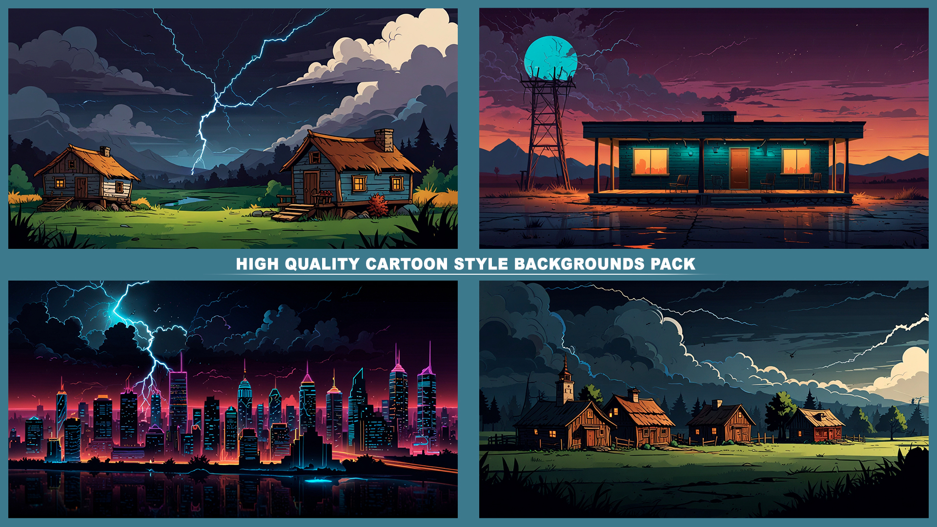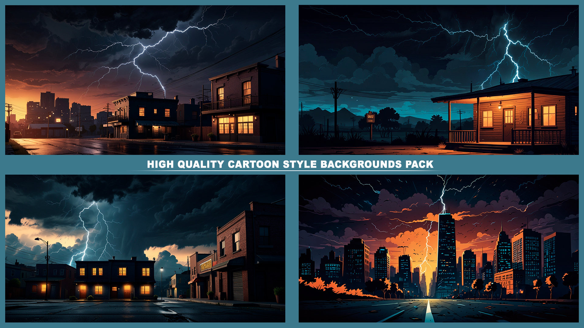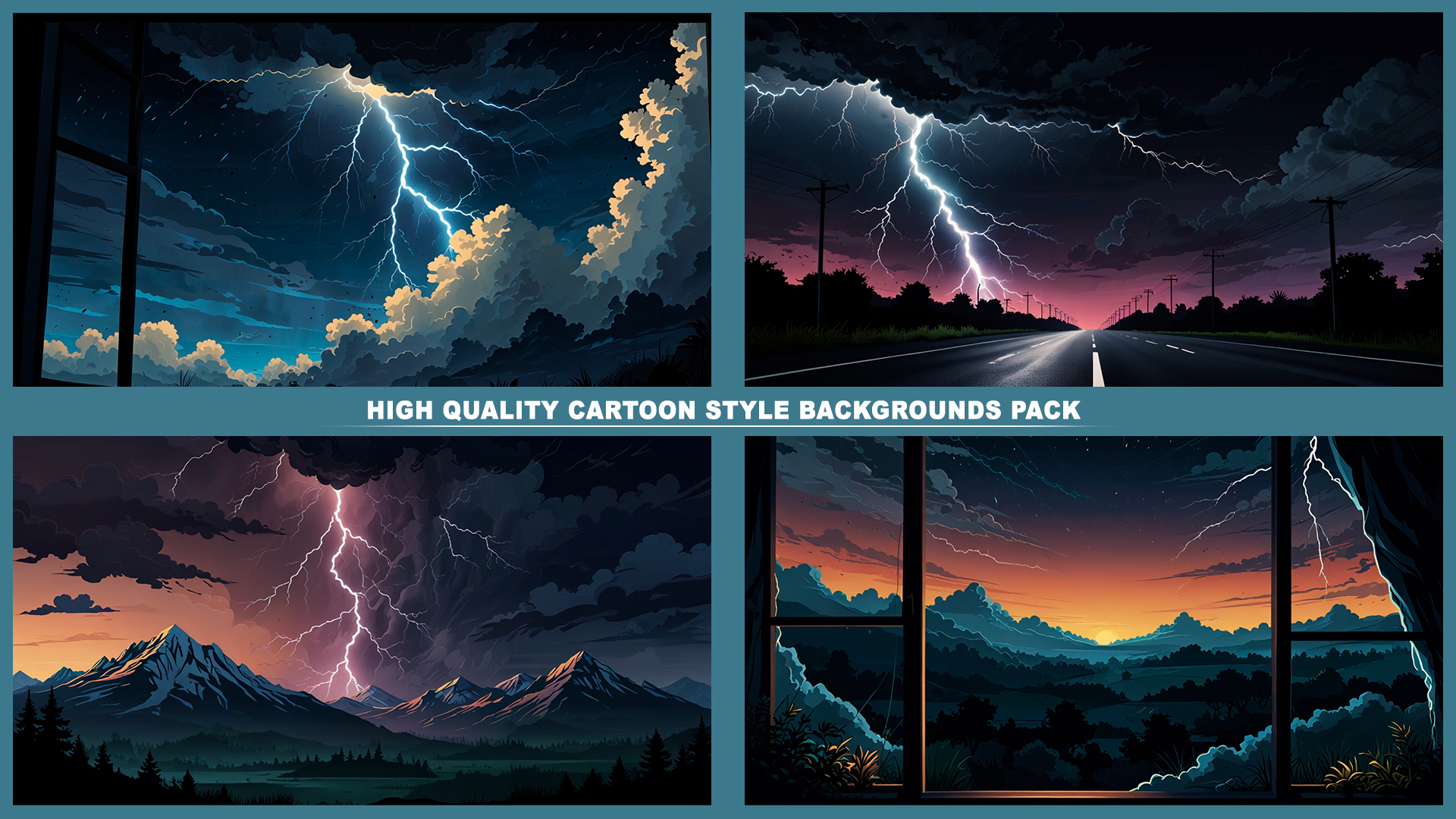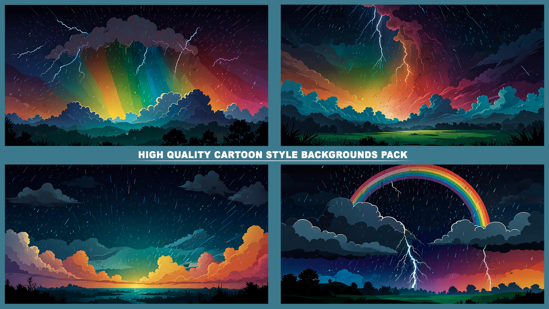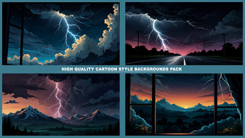 Set of 120+ cartoon style THUNDER STORM 2D background environments.