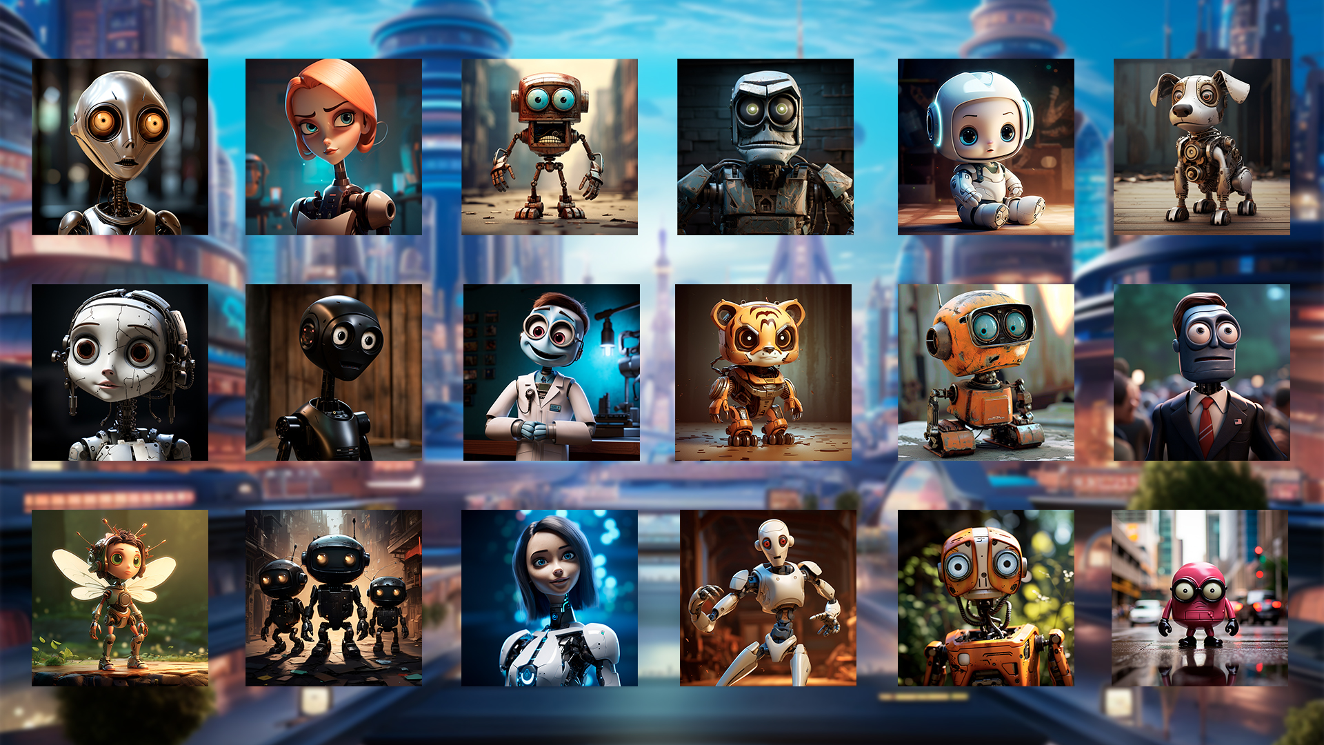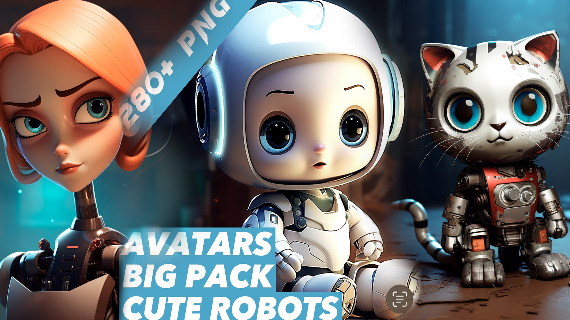 Set of 280+ cartoon style ROBOTS AVATARS 2D icons + BONUS backgrounds.